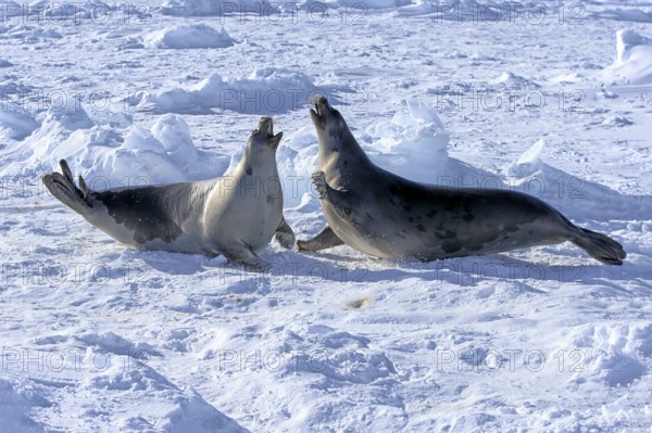 Harp seal (Pagophilus groenlandicus), adult, two females fighting on pack ice, Magdalen Islands, St. Lawrence Gulf, Quebec, Canada, North America