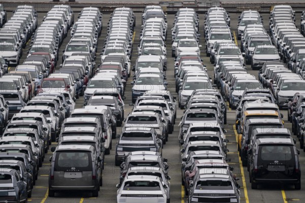 Parking space for import vehicles, hundreds of Hyundai Ioniq, electric cars, waiting for onward transport, at the EUROGATE container terminal in the overseas harbour of Bremerhaven, Lower Saxony, Germany, Europe