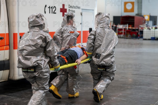 Decontamination of injured persons after an assumed accident involving hazardous substances, fire brigade and aid organisations practise setting up and operating a decontamination station, injured persons are sighted and then washed in a special shower tent to remove possible hazardous substances and chemicals in order to avoid further injuries, the emergency services wear special, ventilated protective suits, large-scale exercise by the Essen fire brigade