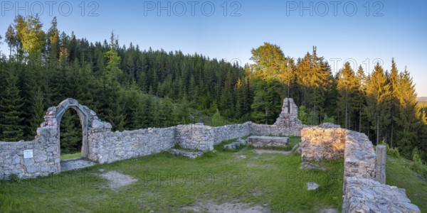 Ruins of the Church of St Nicholas under Krudum in the Imperial Forest in the evening light, Kostel sv. Mikuláše pod Krudumem, Slavkovský les, Karlovy Vary, Karlovy Vary, Bohemia, West Bohemia, West Bohemian Spa Triangle, Karlovy Vary Region, Karlovarský kraj, Czech Republic, Ceská Republika, Europe