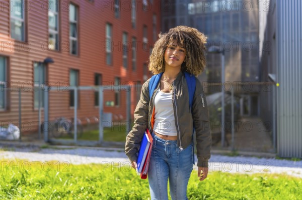 Beauty latin student standing outside the university smiling at camera and carrying folders, notebooks and rucksack