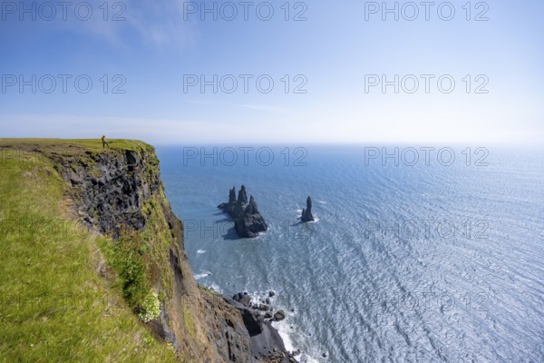 Young man standing on cliff, view from steep cliff to the rocks Reynisdrangar in the water, at Reynisfjara beach, Vik, South Iceland, Iceland, Europe