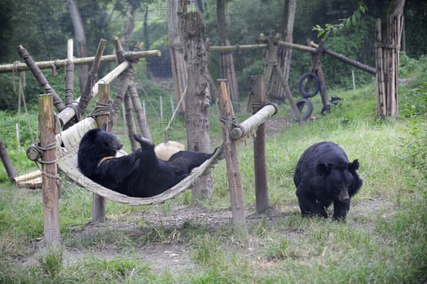 Asian black bears (Ursus thibetanus), Animal Asia Foundation sanctuary, Chengdu, Sichuan (Selenarctos thibetanus), Ruffed bear, Moon bear, enclosure, China, Asia