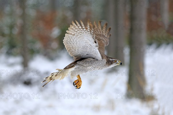 Goshawk (Accipiter gentilis), adult in winter, flying in the snow, Zdarske Vrchy, Bohemian-Moravian Highlands, Czech Republic, Europe