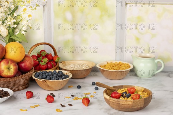 Muesli in a wooden bowl surrounded by ingredients, fruit, strawberries, blueberries, cornflakes, sultanas and oat flakes
