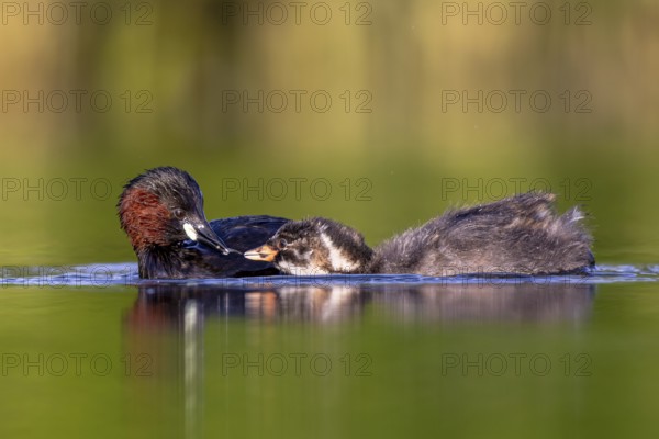 Little Grebe (Tachybaptus ruficollis) adult feeding chick, North Rhine-Westphalia, Germany, Europe