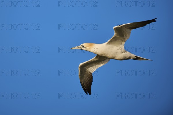 Northern gannet (Morus bassanus) flying in the sky at sunset, wildlife, Helgoland, Germany, Europe