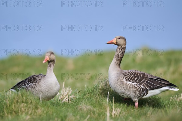 Greylag goose (Anser anser) couple on a field, wildlife, Helgoland, Germany, Europe