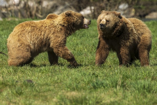 Two bears in a meadow in a playful dialogue, brown bear (Ursus arctos), Germany, Europe