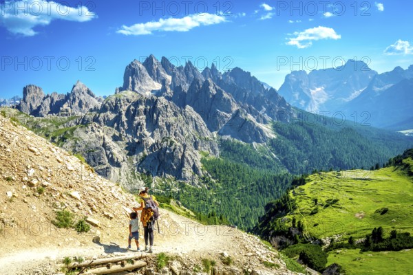 Tourists enjoying breathtaking views while hiking on a scenic trail in tre cime di lavaredo, dolomites, italy, during a sunny summer day