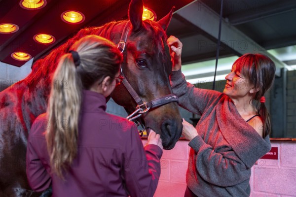 Women with horse in an innovative animal solarium in a rehabilitation center