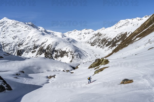 Acitourers climbing up to the Grialetsch Scharte, view of the Funtauna Valley in winter, Graubünden Haute Route, Albula Alps, Rhaetian Alps, Graubünden, Switzerland, Europe