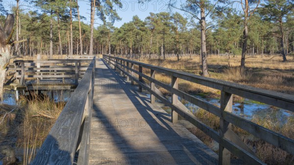 View along a moor bridge in the moor adventure trail, Otternhagener Moor, Resse, Neustadt am Rübenberge, Hanover, Lower Saxony, Germany, Europe