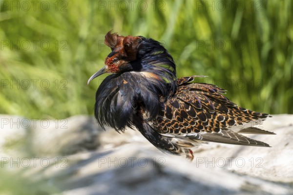 A bird with brown and black feathers stands on a stone in the meadow, ruff (Calidris pugnax, syn.: Philomachus pugnax) courtship displays