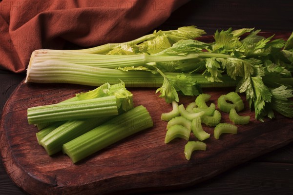 Fresh bunch of celery, top view, no people, on a dark background