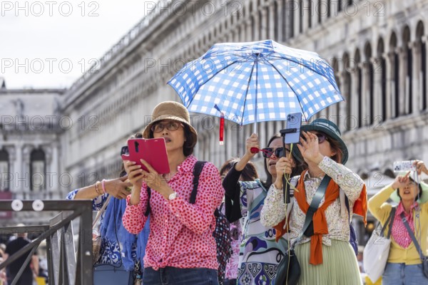 Tourists from Asia with mobile phones and parasols taking photos. Souvenir photo of St Mark's Square, Venice, Venice, Italy, Europe