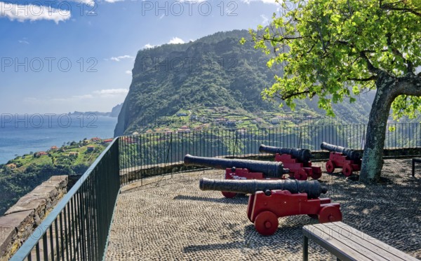 Fortress of Faial with cannons and view of the eagle rock, Penha d'Aguia, Miradouro do Fortim, Madeira, Portugal, Europe