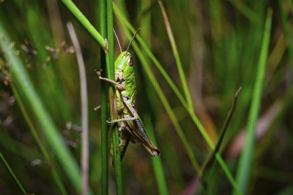A view of a grasshopper in natural habitat on green grass
