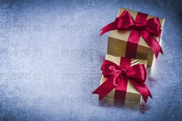 Boxed golden presents with red bow on scratched metallic background
