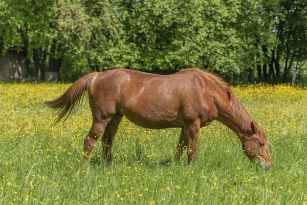 Horse in a green pasture filled with yellow buttercups. Bas-Rhin, Collectivite europeenne d'Alsace, Grand Est, France, Europe