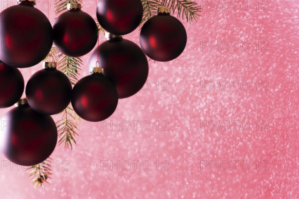 Elegant dark red Christmas balls hanging while snowing, from a snow spray, in bright light, perfect for a Christmas greeting card or banner
