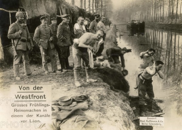 From the Western Front Big spring cleaning in one of the canals off Laon, 1914 - 1918, World War I, reproduction of a war postcard