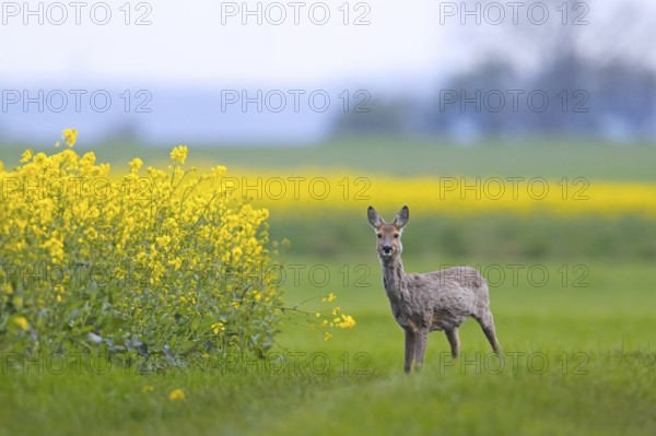European roe deer (Capreolus capreolus) doe, female foraging in rape field in spring