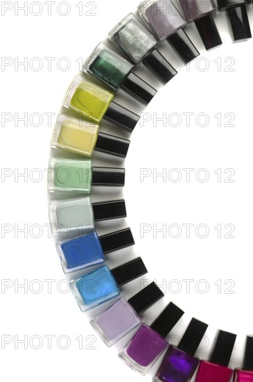 Flaschen mit Nagellack in einem Halbkreis angeordnet. Vertikaler Rahmen. Isoliert auf Weiß