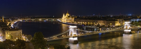 Night panorama of Hungarian Parliament Building, Széchenyi Chain Bridge, and River Danube in Budapest, Hungary, Europe