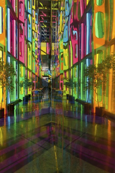 Colourful window reflections in the convention centre, Montreal, Province of Quebec, Canada, North America