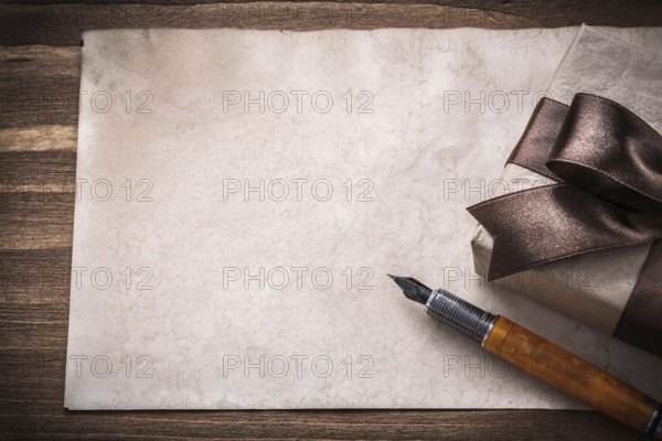 Present box tied bow paper fountain pen on wood board