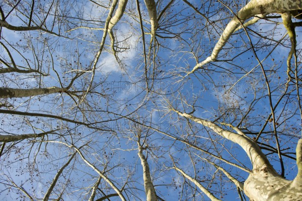 Presentation of plane trees taken in winter with blue sky