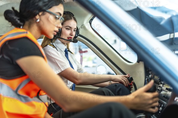 Female pilot and engineer working together inside the cockpit of a small airplane, preparing for take off