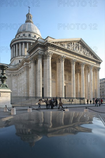 France, ile de france, paris 5e arrondissement, rue soufflot, pantheon, place des grands hommes, colonnade, reflet sur un capot de voiture.