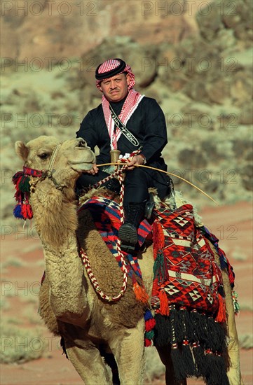 King Abdullah II in traditional Bedouin garb astride his camel in the Wadi Rum desert.