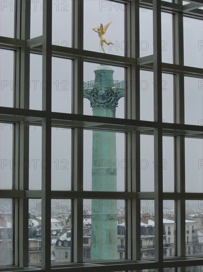 Paris, Place de la Bastille l'hiver sous la neige, Colonne de Juillet (1833-1840) et le Génie de la Liberté