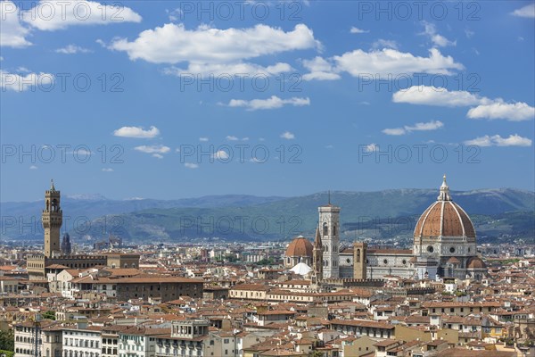 Panoramic view from Piazzale Michelangelo, cityscape with cathedral, Duomo Santa Maria del Fiore, Palazzo Vecchio, Florence, Tuscany, Italy, Europe