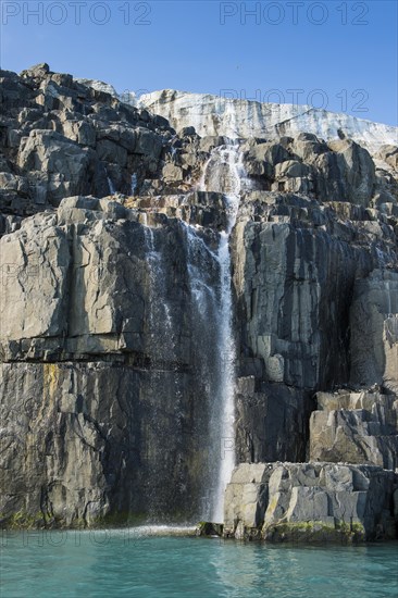 Waterfall in a glacier on Alkefjellet, Svalbard, Arctic, Norway, Europe
