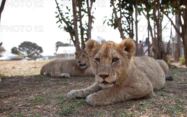 Lion (Panthera leo) cub on ranch, captive, South Africa, Africa