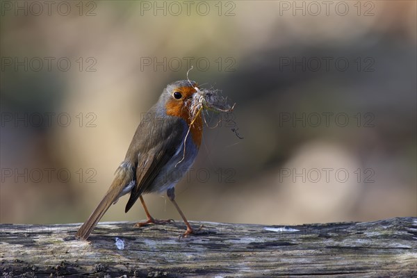 Robin (Erithacus rubecula) with nesting material, Middle Elbe Biosphere Reserve, Saxony-Anhalt, Germany, Europe