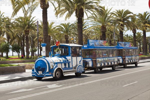 Tourist train in front of palm trees, Salou, Catalonia, Spain, Europe