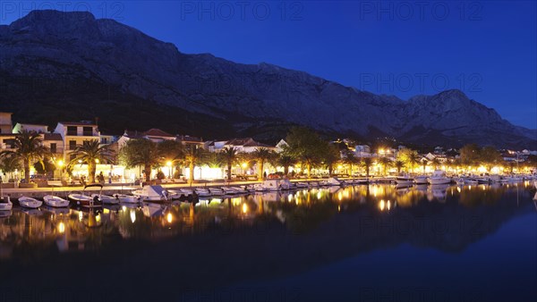 Promenade and harbour at night, Baska Voda, Makarska Riviera, Adriatic coast, Adriatic Sea, Dalmatia, Croatia, Europe