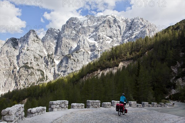 Cyclist in the mountain landscape near the Vrsic Pass with the 2547m high Prisojnik Mountain, Triglav National Park, Julian Alps, near Bovec, Slovenia, Europe