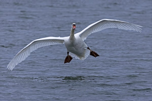 Mute swan (cygnus olor) flying over water, Rhine, Germany, Europe