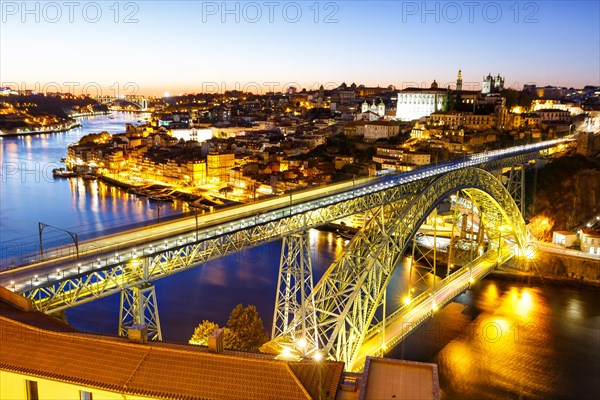 Porto with bridge Ponte Dom Luis I over river Douro night evening travel city in Porto