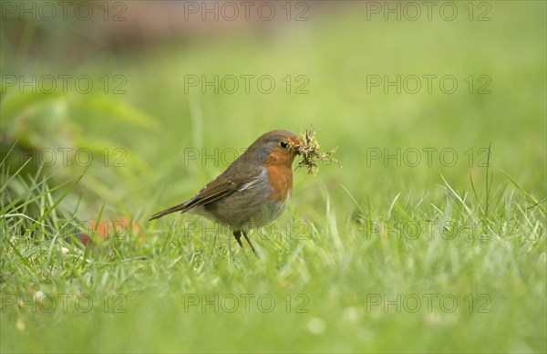 European Robin (Erithacus rubecula) adult, collecting moss for nesting material, Merseyside, England, United Kingdom, Europe