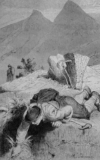 Man digging for roots of, Gentian (Gentiana), for medicinal purposes, digitally restored reproduction of a 19th century original, exact date not known