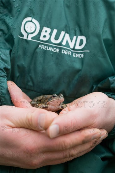 Grasfrosch (Rana temporaria), auf Hand waehrend der Amphibienwanderung, Velbert, Deutschland