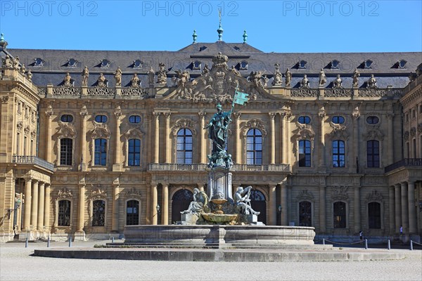 In the old town of Wuerzburg, the Wuerzburg Residenz, the historicist Frankoniabrunnen on the Ehrenhof side, UNESCO World Heritage Site, Wuerzburg, Lower Franconia, Bavaria, Germany, Europe