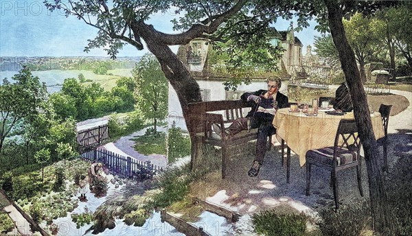 Holiday, young man enjoying the summer at a laid table in the garden, reading in a book and smoking a pipe, 1895, Germany, Historic, digitally restored reproduction of a 19th century original, Europe